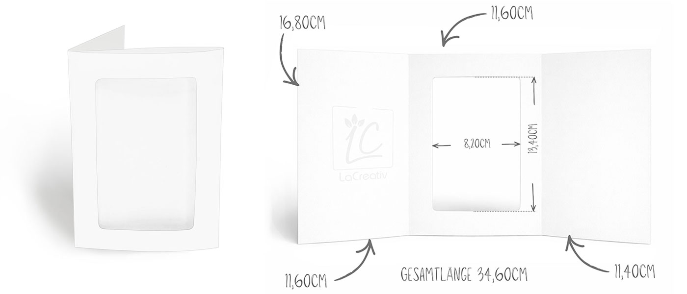- dreifach: 16,8 x 34,6cm dreifach faltbar auf 16,8 x 11,6cm (DIN B6) - Ausschnittsgröße: