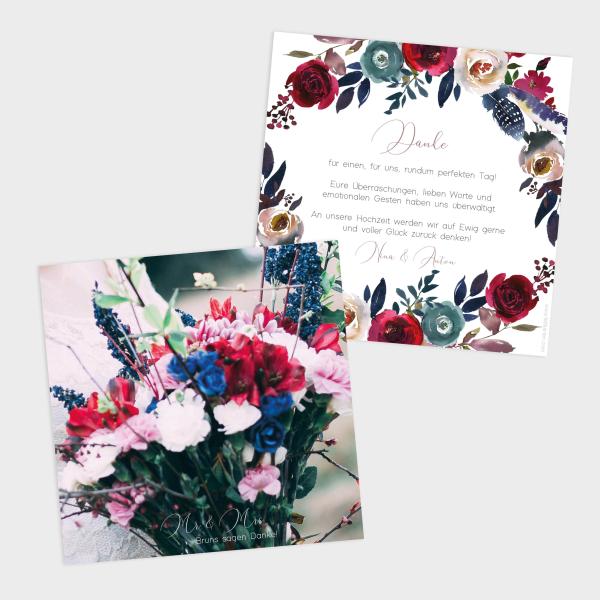 Eure Danksagungskarte im Format "Quadrat 15x15", aus unserer Designserie "Merlot und Navy", könnt ihr über unseren Kartenkonfigurator selbst gestalten.