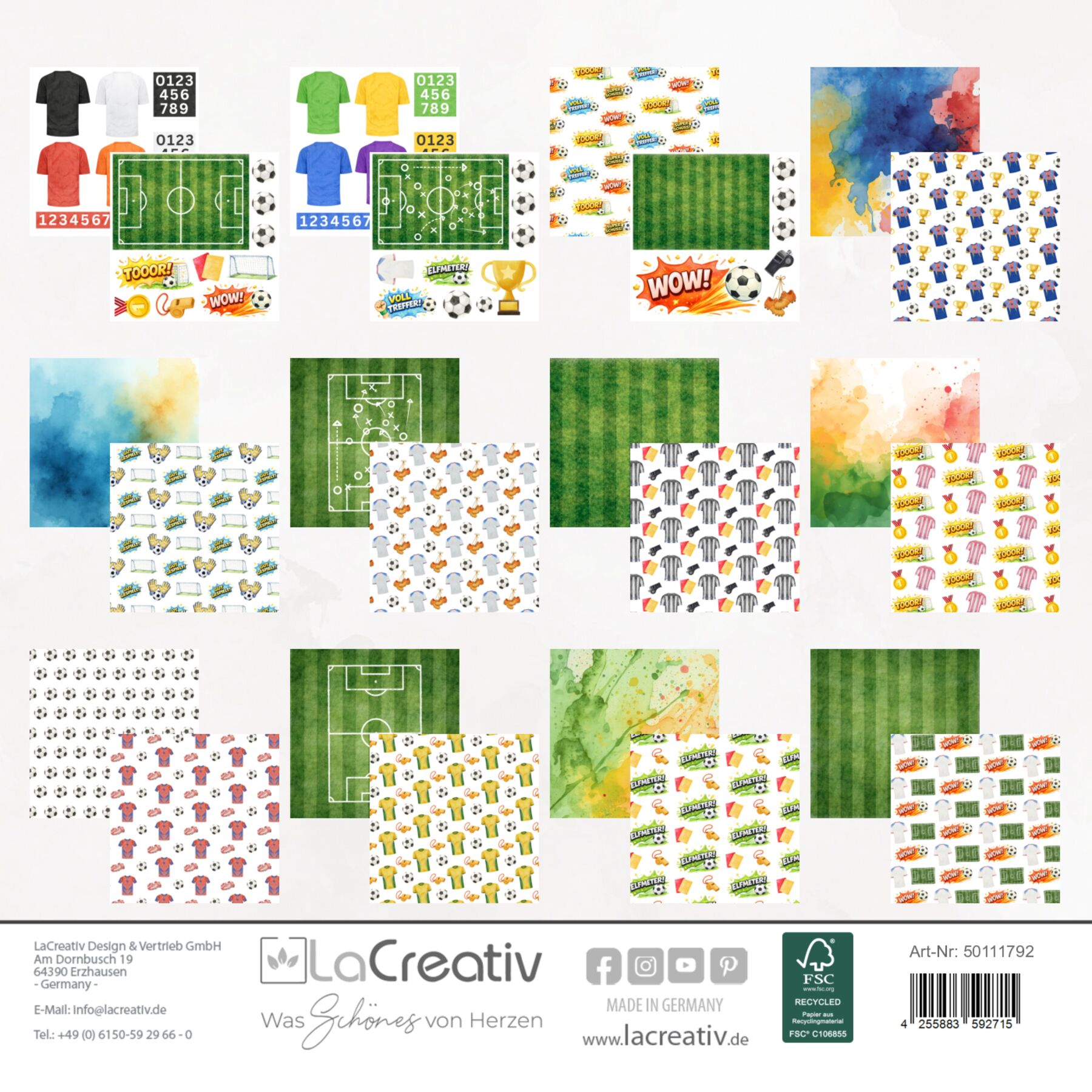 Mit „Fußballfieber“ kommt die Energie des Spielfelds direkt auf deinen Basteltisch. Dynamische Motive mit Fußbällen, Trikots, Toren, Pokalen, Schiedsrichterkarten und Spielfeld-Elementen fangen die Begeisterung rund um das schönste Spiel der Welt ein. Ergänzt durch frische Grüntöne, kräftige Farben und lebendige Aquarellhintergründe entsteht eine sportliche, mitreißende Atmosphäre – wie ein spannender Spieltag voller Emotionen.