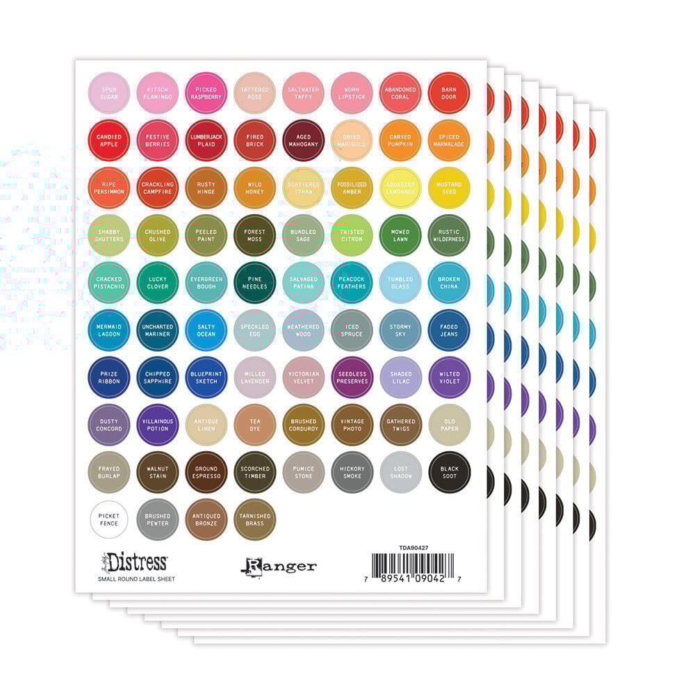 Die Tim Holtz Distress Labels sind eine farbenfrohe Organisationslösung für die gesamte Distress-Produktlinie. Die Etikettenbögen sind in der abgestimmten Distress-Farbpalette gedruckt und zeigen die ikonischen Farbnamen für eine schnelle Orientierung.