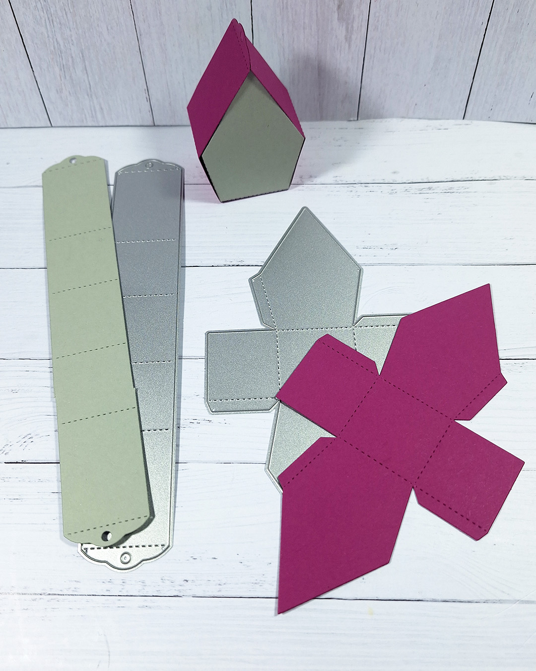 Du stanzt zwei Hauptelemente aus, ziehst die Falzlinien nach und klebst die Teile zusammen, schon steht das kleine Haus. Das Set enthält zwei Stanzformen, mit denen Du die Grundform samt Laschen und Falzlinien sauber ausschneiden kannst.